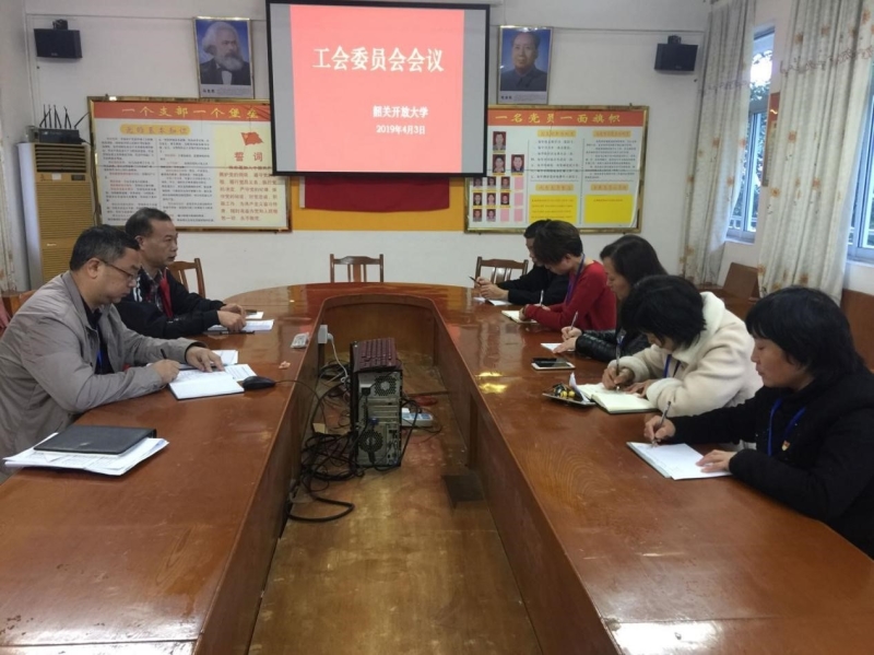 4月3日上午9:15时,韶关开放大学第九届工会委员会会议在我校办公楼三楼会议室召开,会议由新当选的工会副主席曾国尧主持,参加会议的有新当选的工会主席张朝平、委员及经审委员等。