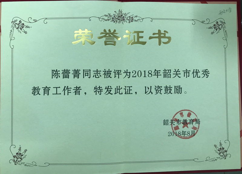 陈蕾菁,女,中共党员,大学本科毕业,硕士学位,2006年至今在韶关开放大学任教,2011年5月被聘任为学校团委书记。从教十几年来,始终坚持努力学习,不断提升自身的教学、业务能力和知识水平,工作勤勤恳恳,任劳任怨,乐于奉献,勇于创新。作为学校团委书记,陈蕾菁老师积极组织开展丰富多彩的团务活动和学生会活动,所组织的活动荣获“国家开放大学优秀校园学生活动”。2018年获得“韶关市优秀教育工作者”荣誉称号。
