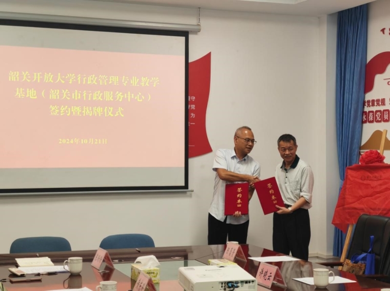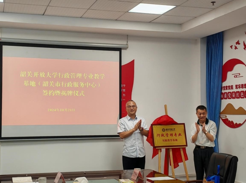 在行政服务中心办事处,傅树群副校长与裴斐副主任共同签署了《韶关开放大学行政管理专业校外教学实践基地协议书》,并进行了教学实践基地揭牌仪式。