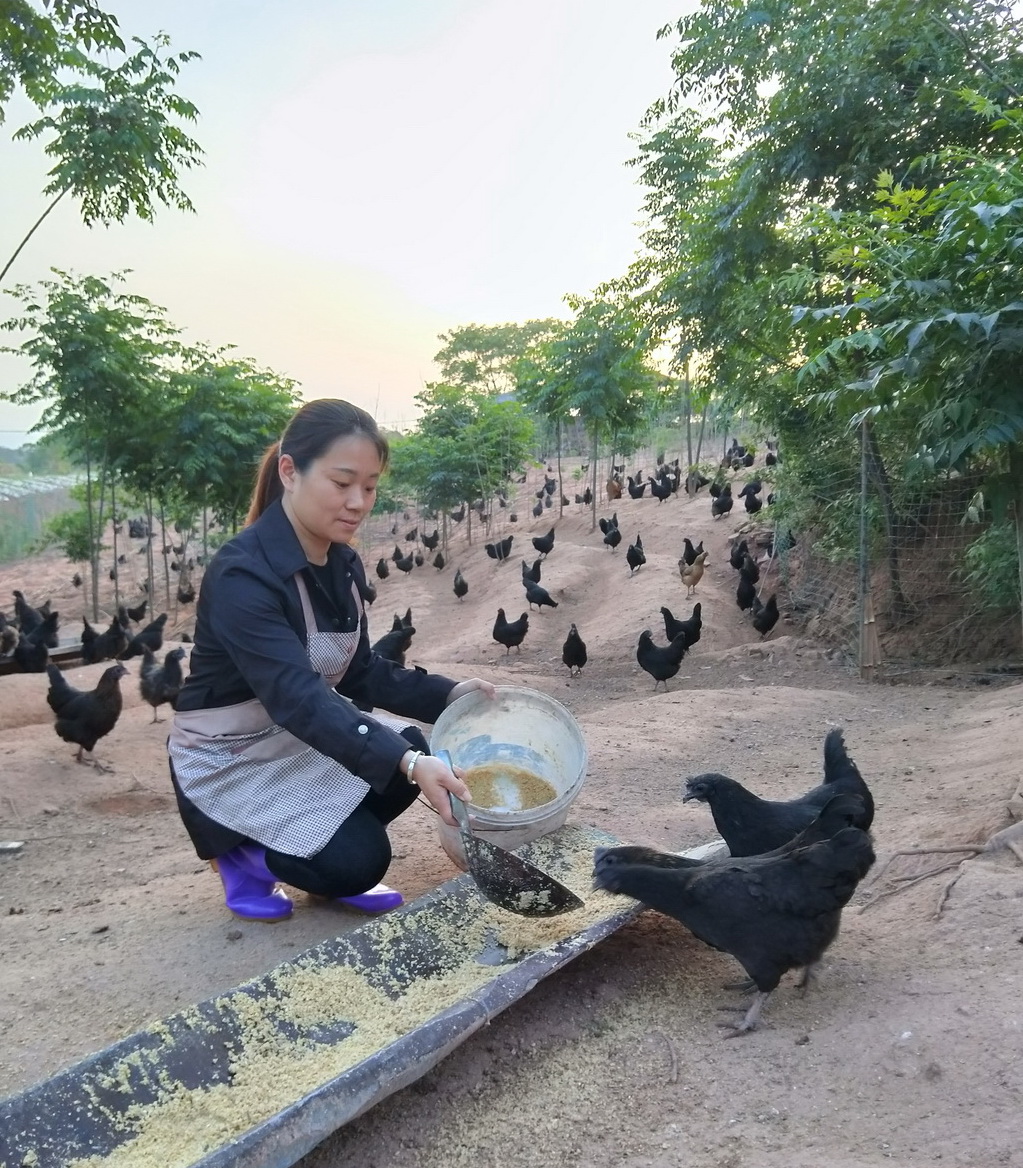 为了进一步提升经济效益与生活幸福感,她坚持开拓市场,将产业转型升级,放弃了蒸蒸日上、稳操胜券的生猪养殖业,转而探索发展特色种养——“五黑鸡”养殖。她的成功转型升级,高质量、高品质发展,公司连续两年被南雄市农业局指定为“农业科技试验示范基地”,每年有300多人次到农场学习参观考察,成功引领了一批新型职业农民,加快了农民思路的转型升级。同时,在东莞对接韶关精准扶贫的大背景之下,采用“公司+合作社+农户+互联网”的模式,免费提供技术指导,现带动了贫困户321户723人脱贫致富,增收达300余万。2016年带领贫困户养殖五黑鸡5000多只,产值达80多万元。2017与多家合作社合作,带动204户贫困户464人增收,每户年均增收6640元。带领农户养殖“五黑鸡”1.5万只,产蛋90万枚,产值达410万、种植优质水稻250亩,产值达110万。