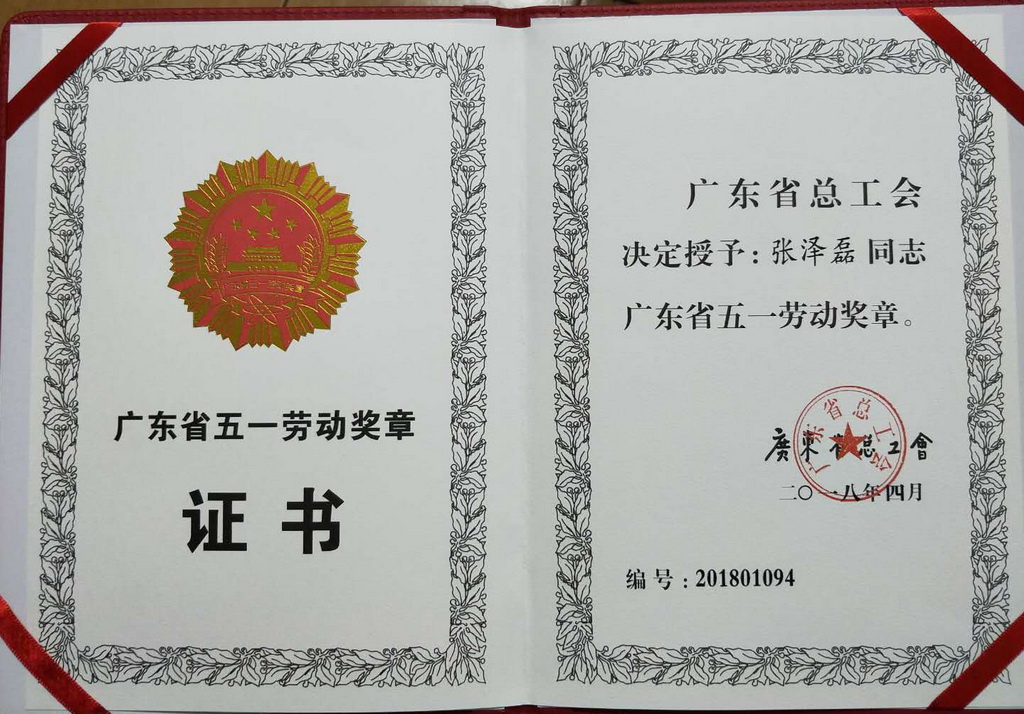 张泽磊由于自己勤学肯干,得到了公司领导和同事的一致好评。2006年至今两次被评为韶瑞重工公司“先进员工”称号,一次评为西联镇“优秀共产党员”荣誉称号。2014年被破格提拔到技术部任技术员。工作中利用所学知识不断的提高工作效率,2018年5月获得广东省“五一劳动奖章”荣誉。