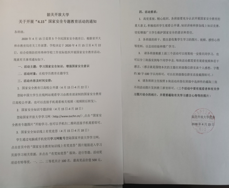 韶关开放大学开展4.15国家安全教育专题教育活动