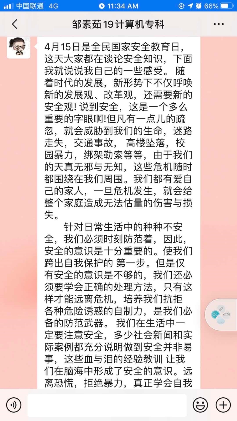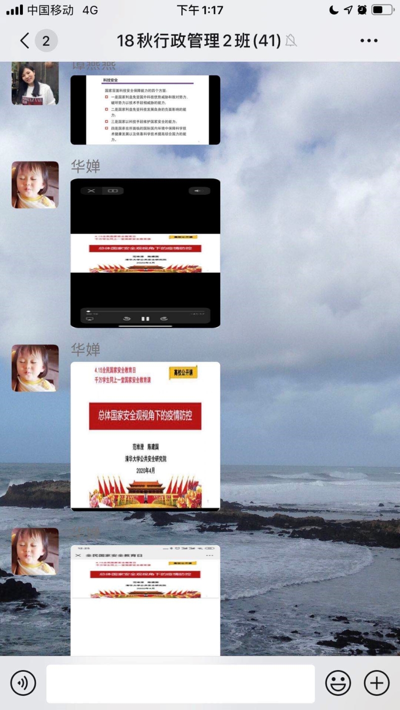 校团委组织广大师生“同上一堂国家安全教育课”,通过在线教育平台共同观看了《国家安全教育日高校公开课》、《国家安全知识专题讲座》等安全教育视频,师生们学习热情高涨,并纷纷撰写心得,交流学习体会;此外还按照《广东省开放大学关于组织开展学生安全知识学习答题活动的通知》要求,积极组织发动学生积极参与安全知识学习答题活动,不少学生通过使用学习网账号登陆到国家开放大学学习网踊跃进行答题。同时各班级班干,以班级形式召开线上主题班会,向同学们普公共卫生安全、网络安全等国家安全知识,提高同学们维护国家安全的自觉性和主动性。通过举办系列宣传教育活动,推动国家安全教育入耳入脑入心,极大地激发了广大师生的学习热情,有利于进一步提高广大师生国家安全意识,增强维护国家安全的责任感与使命感。