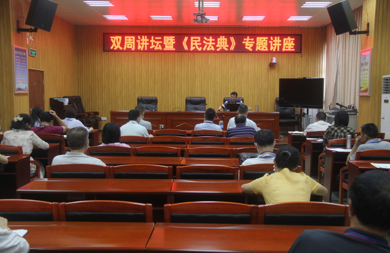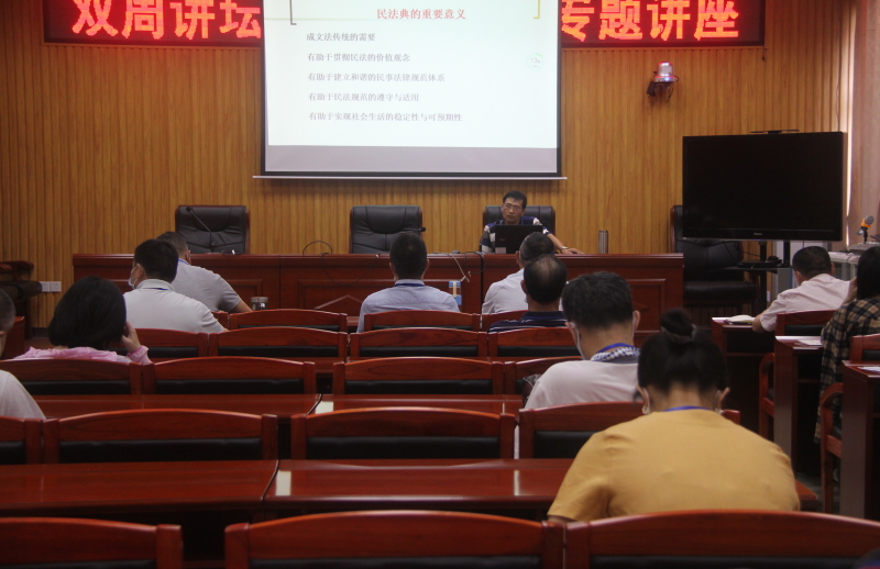 我校教师古锦宝(韶关市律师协会“民法典”普法宣讲团成员)作了学习《民法典》的主题讲座,对《民法典》的重大意义、编纂工作、主要内容作了系统讲解,对《民法典》的鲜明特色和增加、修改的条款进行了现场解读。教职工要带头做学法、守法、普法的模范,把学习《民法典》纳入日常重要学习内容,要把《民法典》作为行政决策、行政管理、行政监督的重要标尺;要深入推进普法宣传教育,全方位多角度阐释解读民法知识;要带头宣传、推进、保障《民法典》实施,加强检查和监督,确?!睹穹ǖ洹返玫饺嬗行е葱?。