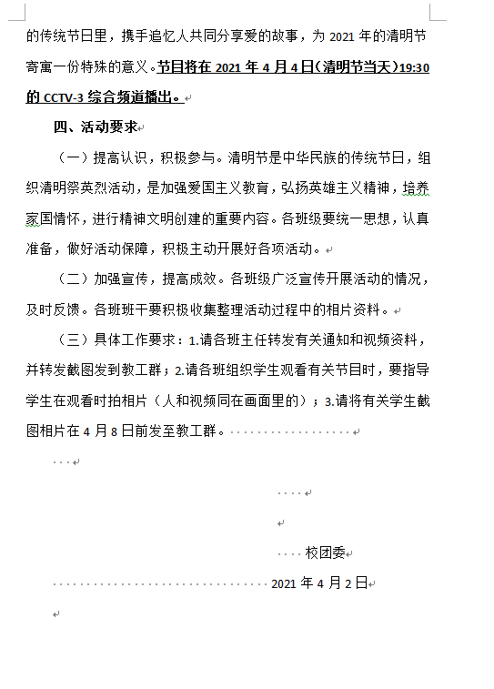 一是校团委向全校师生发出2021年清明节文明祭扫倡议书》,向广大师生在全社会营造一个文明、环保、节俭、安全的良好祭祀氛围;二是开展了一次网上祭奠革命先烈网上祭扫活动。发动广大师生通过登陆中华英烈网参加网上祭奠、发表祭奠感言等,表达对先烈、先人、先贤的感恩和敬仰。祭扫英烈共有致敬英烈、祭扫英烈、敬献花篮共三个版块;三是组织广大师生网上观看观看央视播出的清明特别节目《多情的土地》。