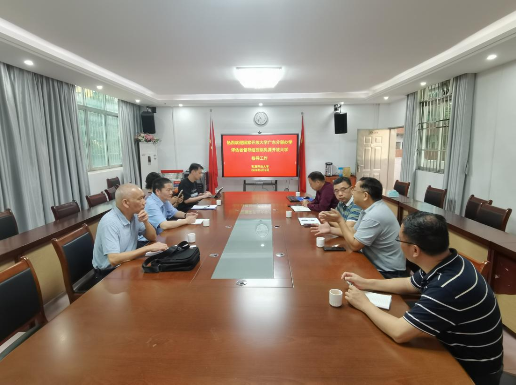 2024年4月1日-2日,国家开放大学广东分部办学评估督查小组领导刘汉民、赖粵东、袁立梅、叶铭涛来我校实地督查。4月1日上午,在综合楼431会议室召开国家开放大学广东分部体系办学评估自评工作汇报会,办学评估督查小组领导、学校领导班子成员和各一级指标负责人参加了会议?;嵋樯系澄?、副校长张朝平做自评工作汇报;党委书记、校长钟东对县(区)的自评工作遇到的难点进行了阐述;评估办各一级指标负责人就评估材料与督查组进行沟通交流,督查组领导对我校老师们提出的问题均耐心解答。