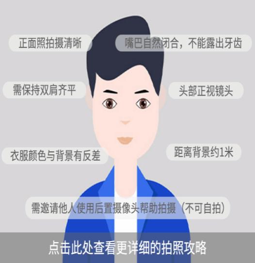 (2)【眼镜】常佩戴眼镜者可以佩戴眼镜拍摄,但不得配戴有色(含隐形)眼镜,拍摄时镜框不能遮挡眼球,眼镜不能有大面积的反光现象。