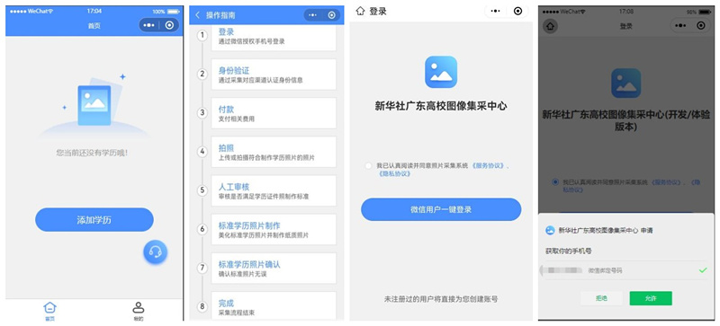 四、采集费用:(1)预约期内自行在线缴纳15元/人,包含纸质相片制作费与电子相片加密处理费;(2)错过预约期的,需登录“新华社广东高校图像散拍中心”小程序(以下称“散拍中心”)进行采集,费用为60元/人,包含纸质相片制作费与电子相片加密处理费、相片快递费用;(3)如误缴费用,可与客服联系退费;(4)采集费用均由广东图像采集中心收取,学校不收取任何其他费用。