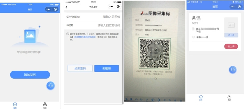 2.通过相册,或者拍照上传学信网图像采集码,系统将自动识别,并获取学生用户基本信息。