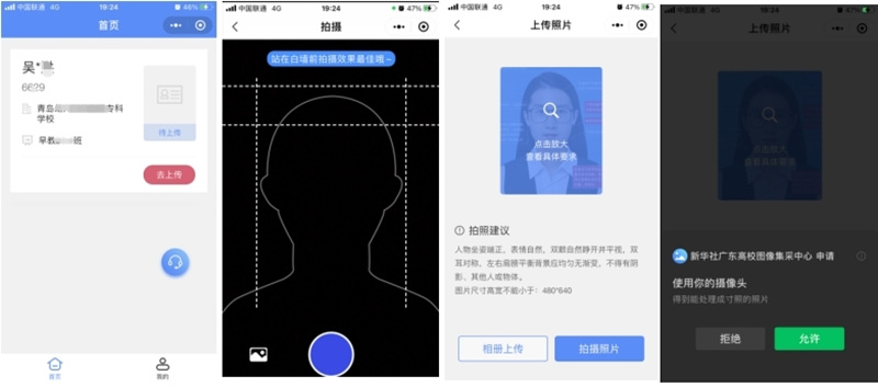(五)相片采集后,需留意微信信息是否审核通过。如未通过,需重新提交合格照片,逾期不提交者视为未拍。若多次审核不通过的同学,请进入小程序下载已上传的图片检查。