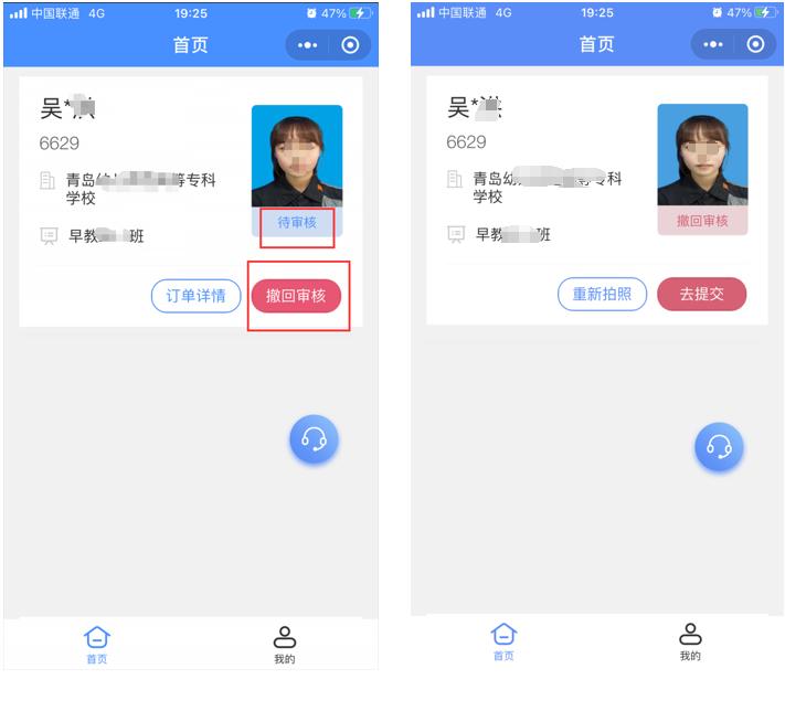 用户提交照片审核后,在待审核状态下,可以点击【撤回审核】按钮,撤回照片,撤回后,可以重新拍照上传照片。