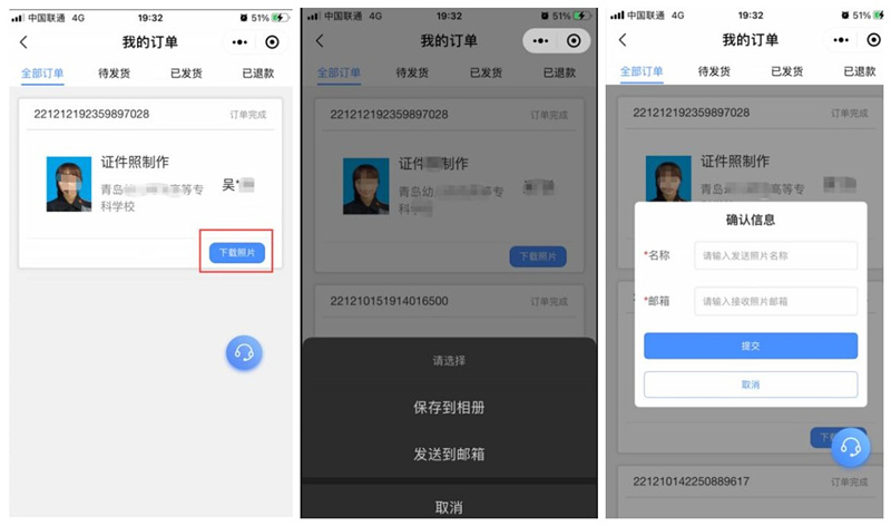 2.已完成的订单可以下载照片,可以直接保存手机相册,也可以发送到邮箱。