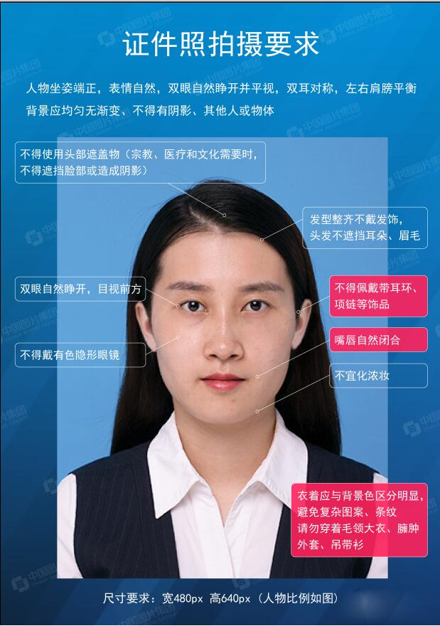 (5)【头发】拍照前请先梳理头发,避免头发凌乱。长发需置于耳后,露出额头和耳朵。
