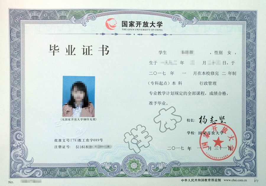 国家开放大学毕业证书样本