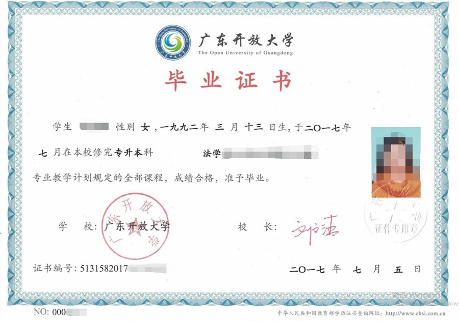 广东开放大学毕业证书样本