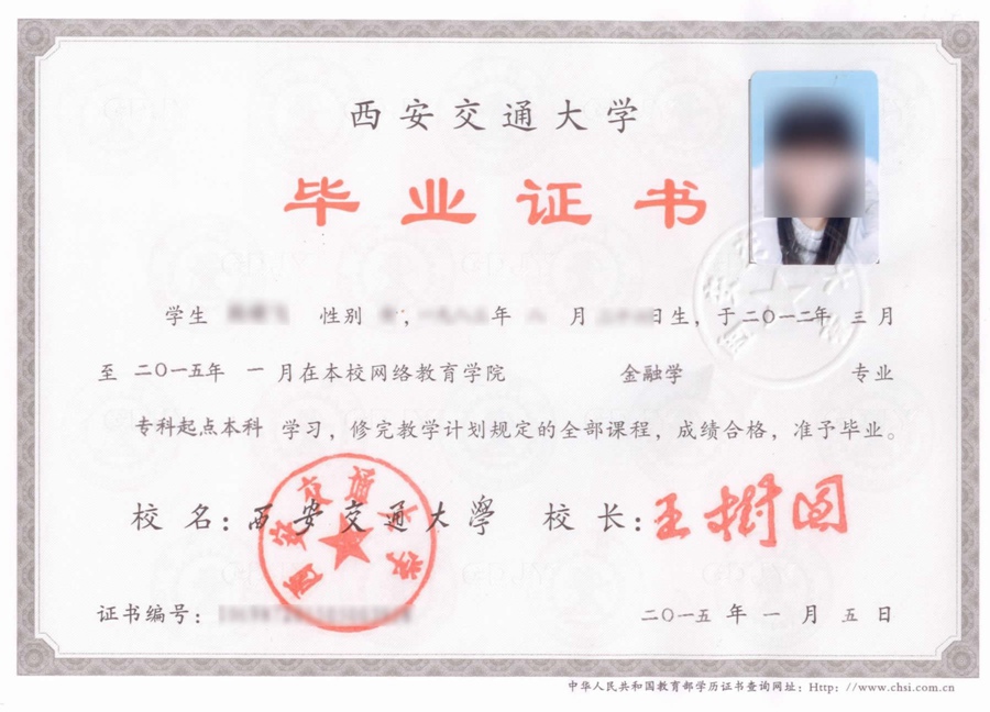西安交通大学(网络教育)毕业证书样本